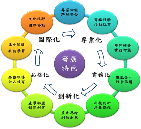 本院之發展特色涵蓋教學、研究、輔導及服務四大層面,其十大發展特色為「專業知能,跨域整合」、「實務教學,接軌就業」、「雙師輔導,實務增能」、「證能合一,競爭倍增」、「科技創新,活化課程」、「多元思考,創新創意」、「產學聯盟,創新創業」、「品格領導,全人教育」、「社會關懷,服務學習」、「文化視野,國際移動」,朝向「專業化、實務化、創新化、品格化、國際化」邁進,如下圖所示。